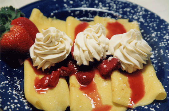 Served with strawberries engulfed with pure whipped cream. Thicker and softer than French Crêpes, our recipe is made with fresh orange juice and many eggs. -
